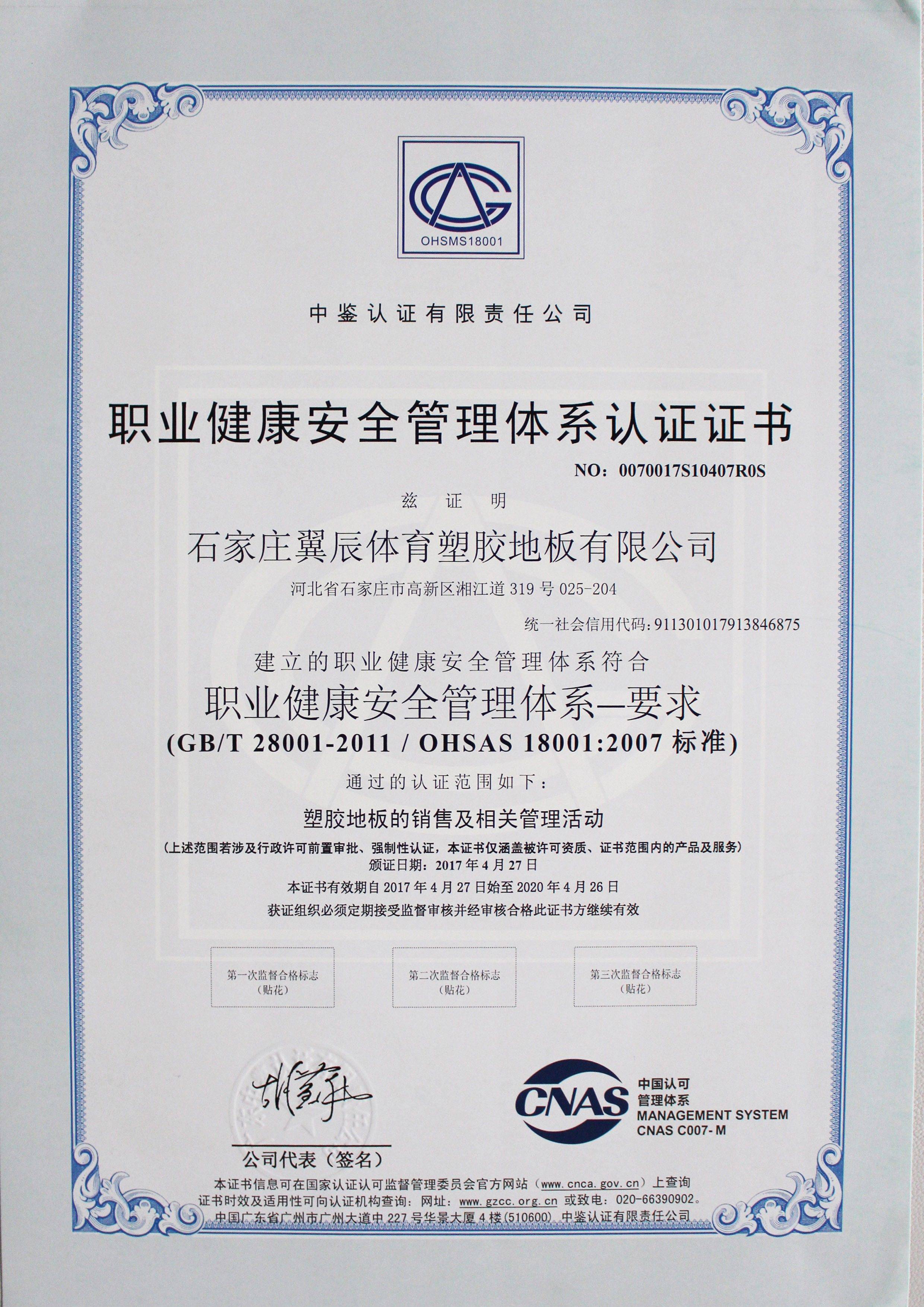 PVC塑膠地板-職業(yè)健康安全管理體系認證證書
