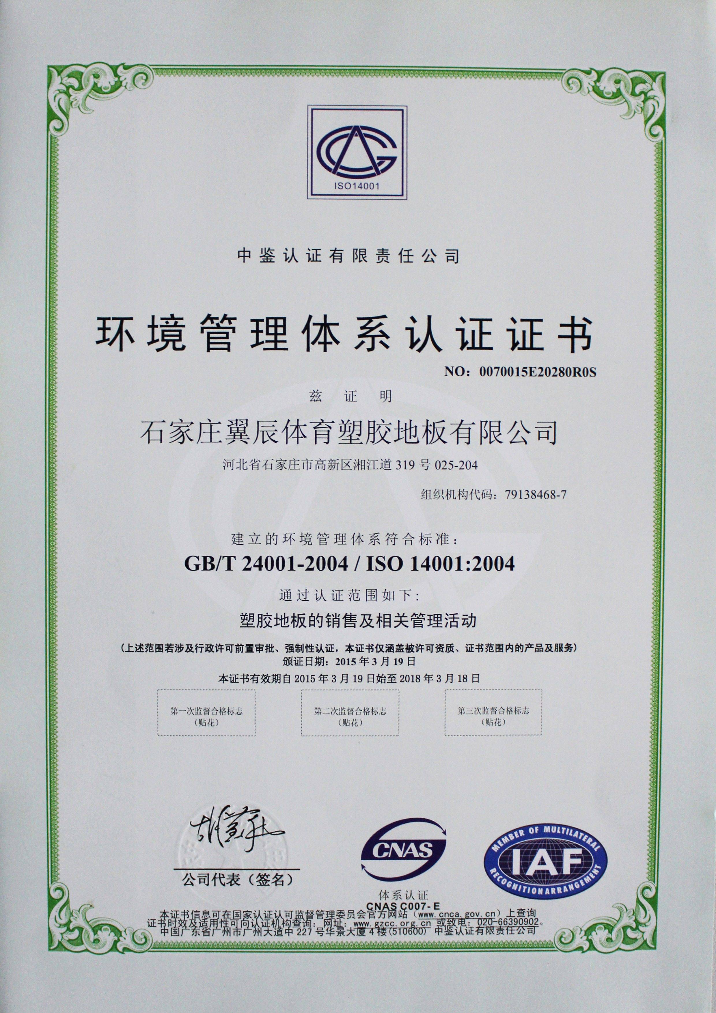 PVC塑膠地板-環(huán)境管理體系認證證書